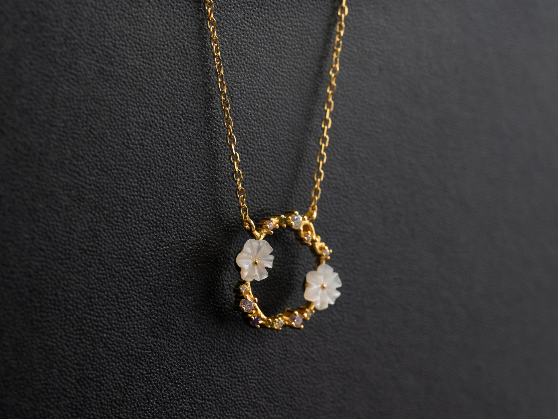 El Blossom Necklace destaca por su forma circular, adornada con flores talladas y detalles brillantes que aportan un toque sutil de color. Fabricado en plata esterlina 925 con incrustaciones de zirconia, este diseño combina delicadeza y estructura, ideal para realzar cualquier look sin esfuerzo.